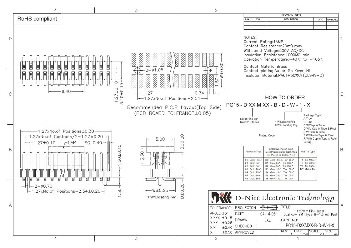 Your location  Home -> Products  ->  Connector  ->  Pin Header  ->  1.27 pitch  ->  1415 PC15-DXXMXX-B-D-W-1-X