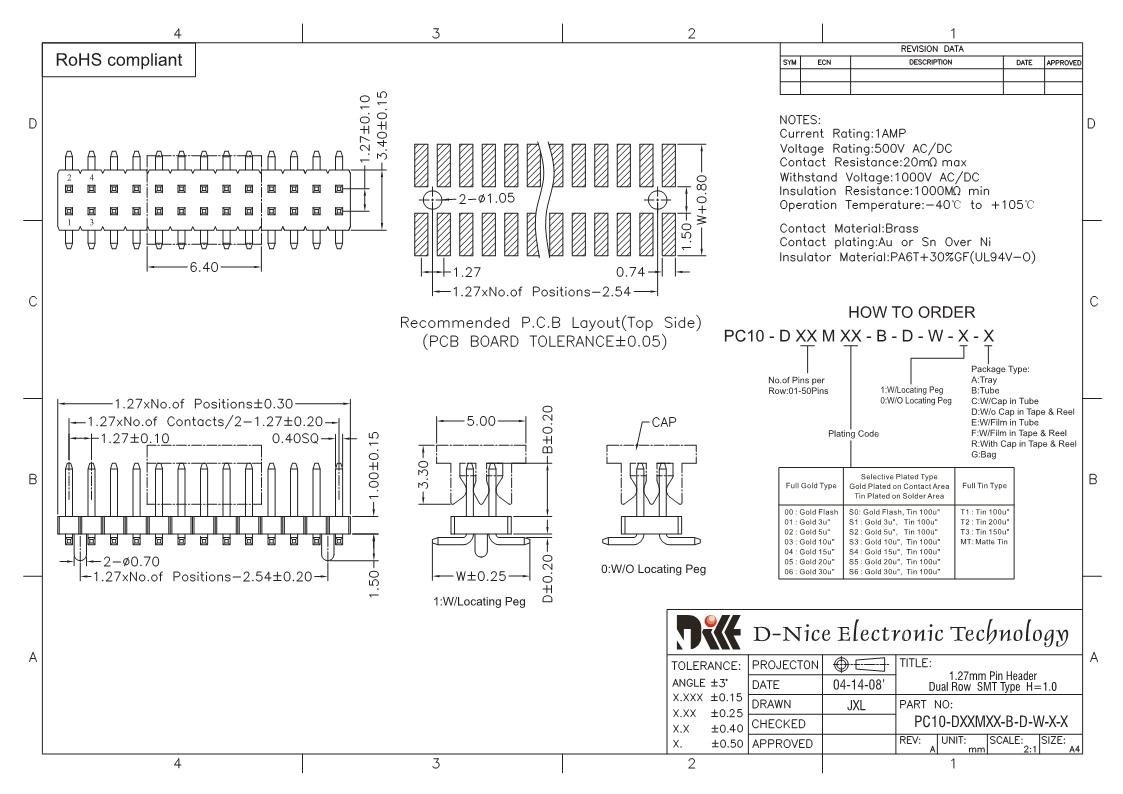 Your location  Home -> Products  ->  Connector  ->  Pin Header  ->  1.27 pitch  ->  1407 PC10-DXXMXX-B-D-W-X-X