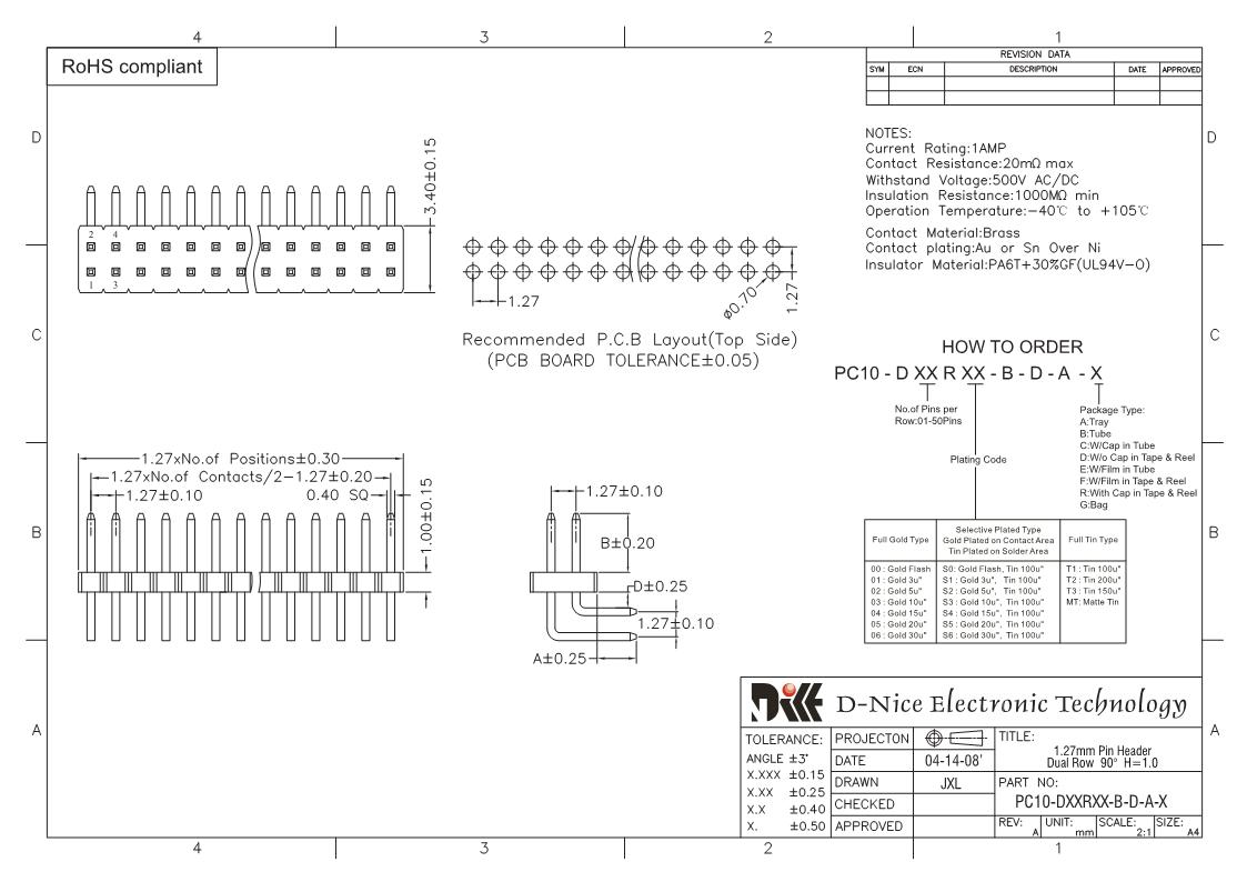 Your location  Home -> Products  ->  Connector  ->  Pin Header  ->  1.27 pitch  ->  1405 PC10-DXXRXX-B-D-A-X