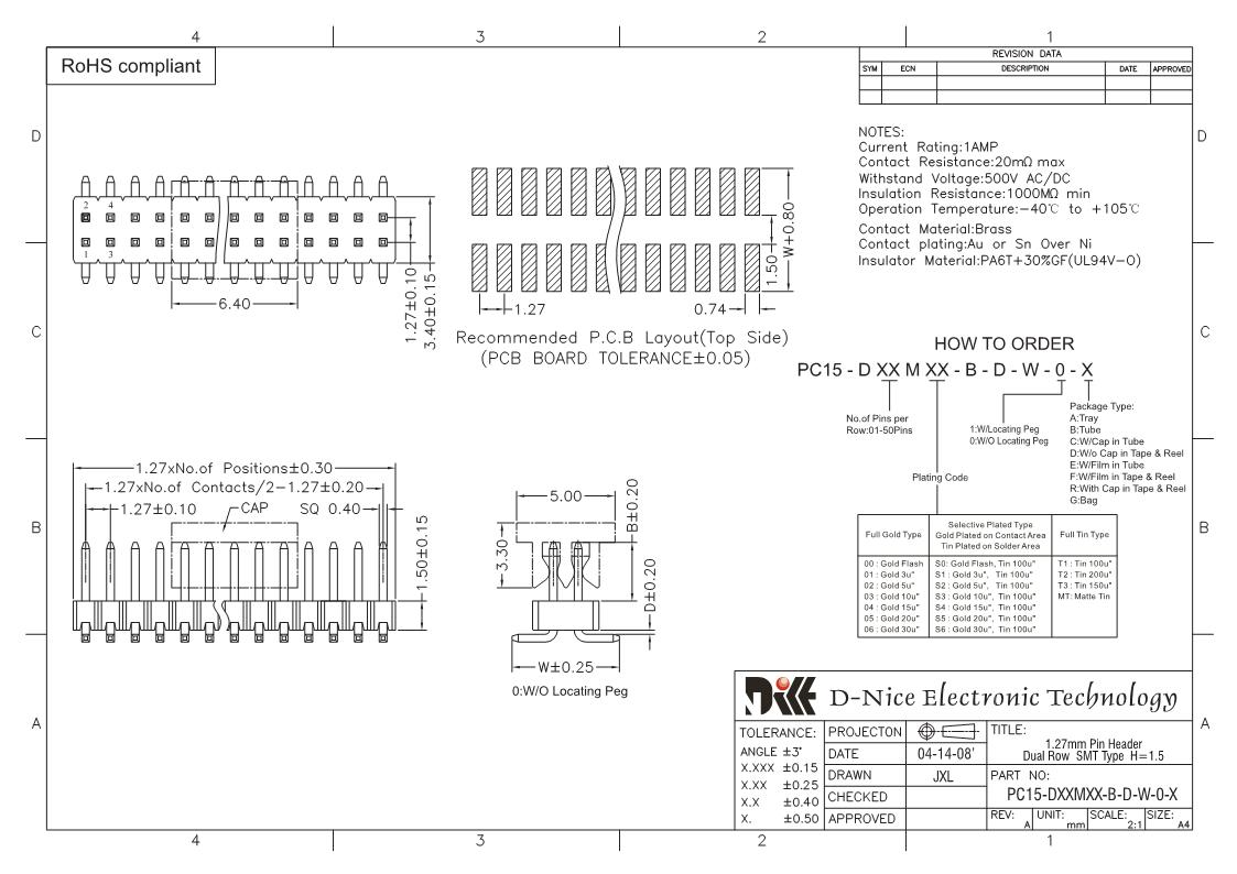 Your location  Home -> Products  ->  Connector  ->  Pin Header  ->  1.27 pitch  ->  1404 PC15-DXXMXX-B-D-W-0-X