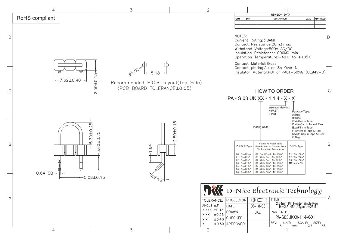 Your location  Home -> Products  ->  Connector  ->  Pin Header  ->  2.54 pitch  ->  1613 PA-S03UKXX-114-X-X
