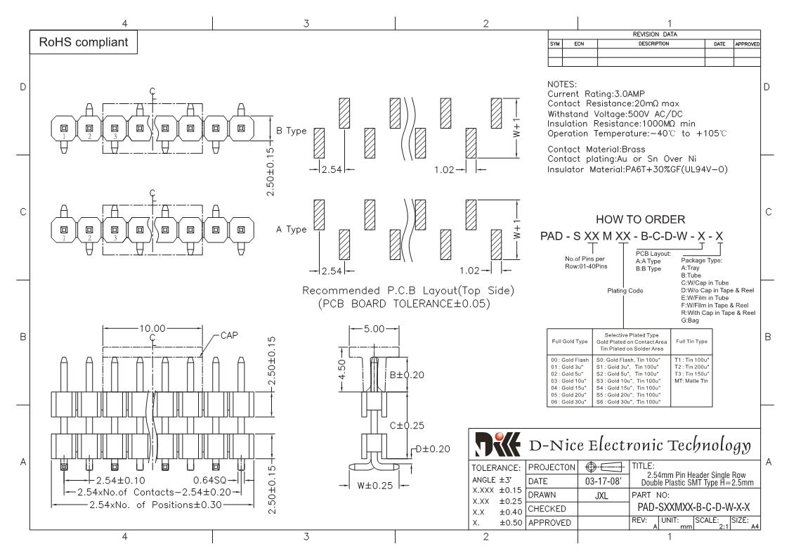 Your location  Home -> Products  ->  Connector  ->  Pin Header  ->  2.54 pitch  ->  1610 PAD-SXXMXX-B-C-D-W-X-X