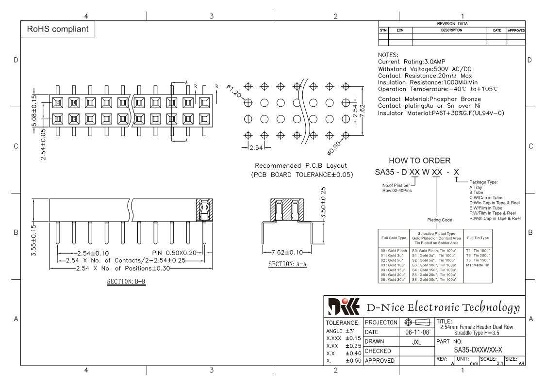 Your location  Home -> Products  ->  Connector  ->  Female header  ->  2.54 pitch  ->  2506 SA35-DXXWXX-X